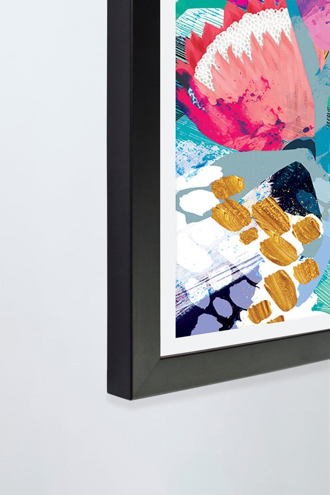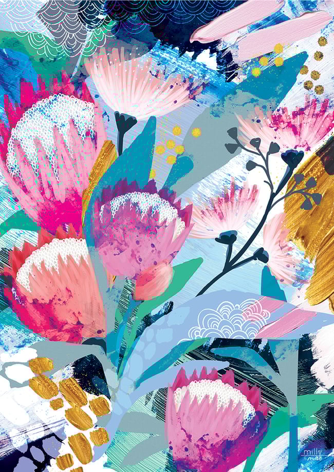 This beautiful abstract representation of a Protea is full of vibrant colours, lively strokes and textures, perfectly suited to large scale printing.