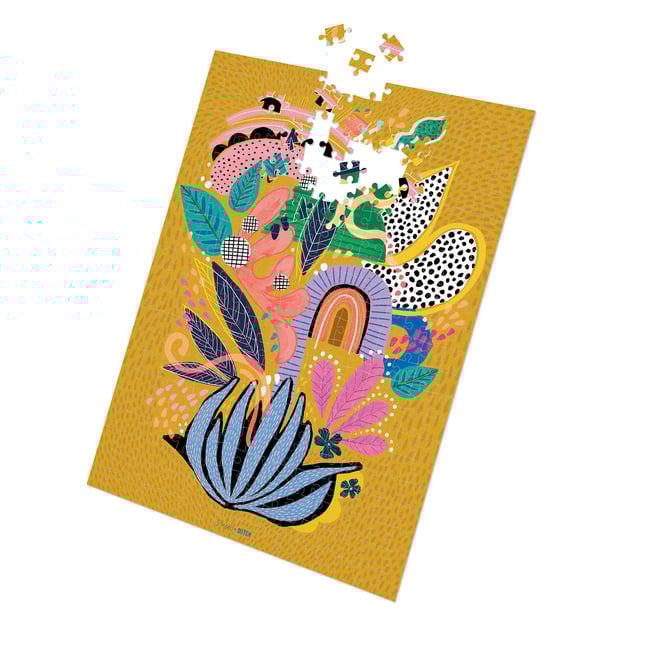 The Hullabaloo puzzle, designed by Milly and Mae, is a carefully cluttered abstract puzzle featuring colourful vibrant expressive shapes and strokes off a textured yellow backdrop. A vibrant piece that will brighten up any room in your home.